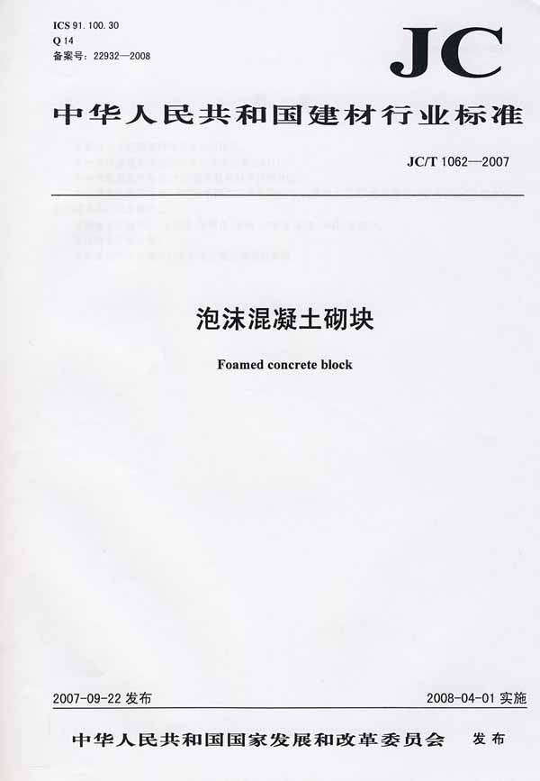 施工單位應當對進入施工現場的墻體材料、保溫材料、門窗、采暖制冷系統和照明設備進行檢驗,不符合施工圖設計文件要求的,不得使用。 中華人民共和國建材行業標準 JC/T1062-2007 泡沫混凝土砌塊 2008-04-01實施 國家標準 |